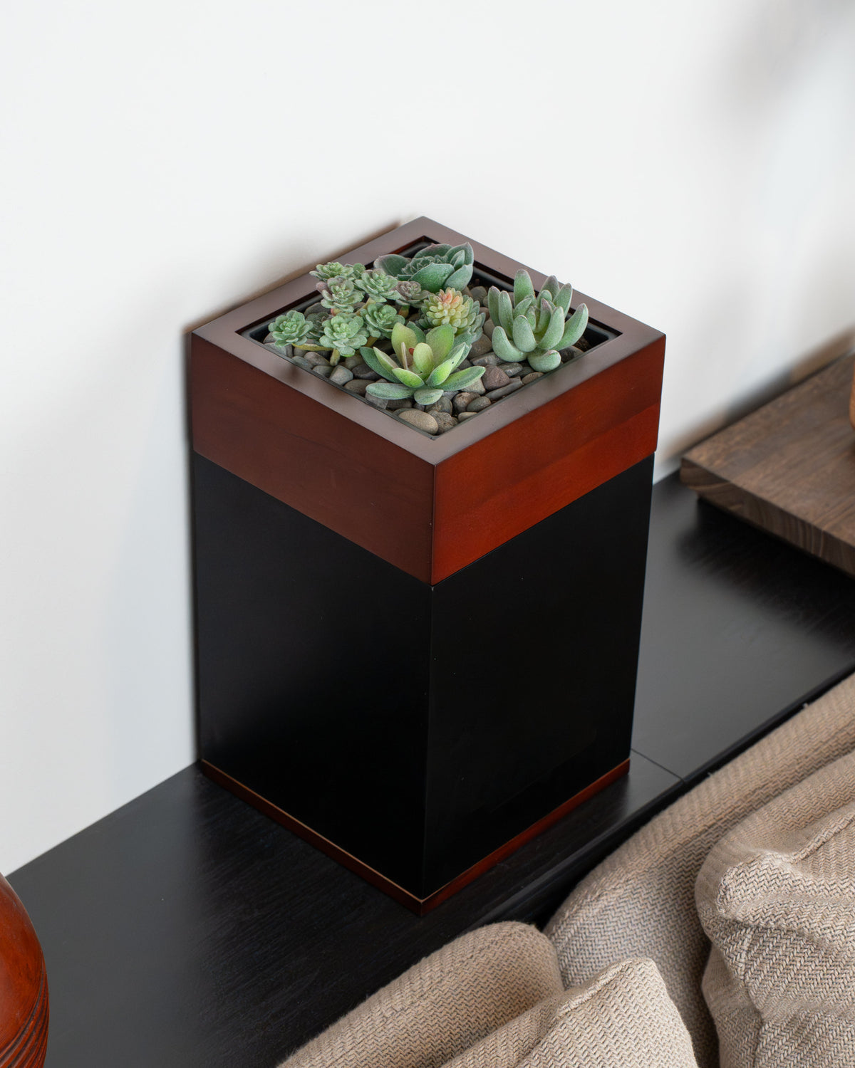 Use small succulents or mini cacti that thrive in shallow soil, or choose artificial plants for a zero-maintenance option.